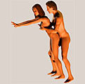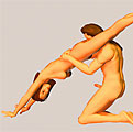 立った状態の男が、女の両脚をつかんで逆さづりにする。開いた女の脚を開かせ、それをまたいだ状態で上から挿入する。